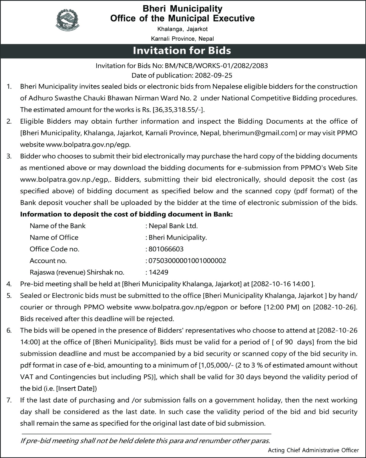 Home » बोलपत्र आव्हानको सूचना - स्वास्थ्य चौकी भवन निर्माण, वडा २ ।
